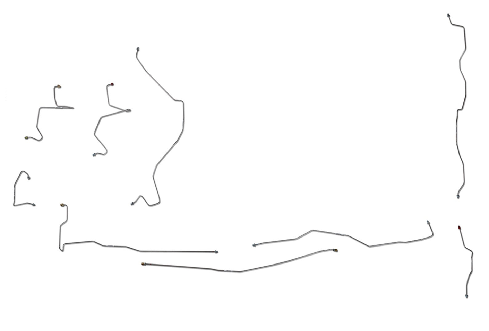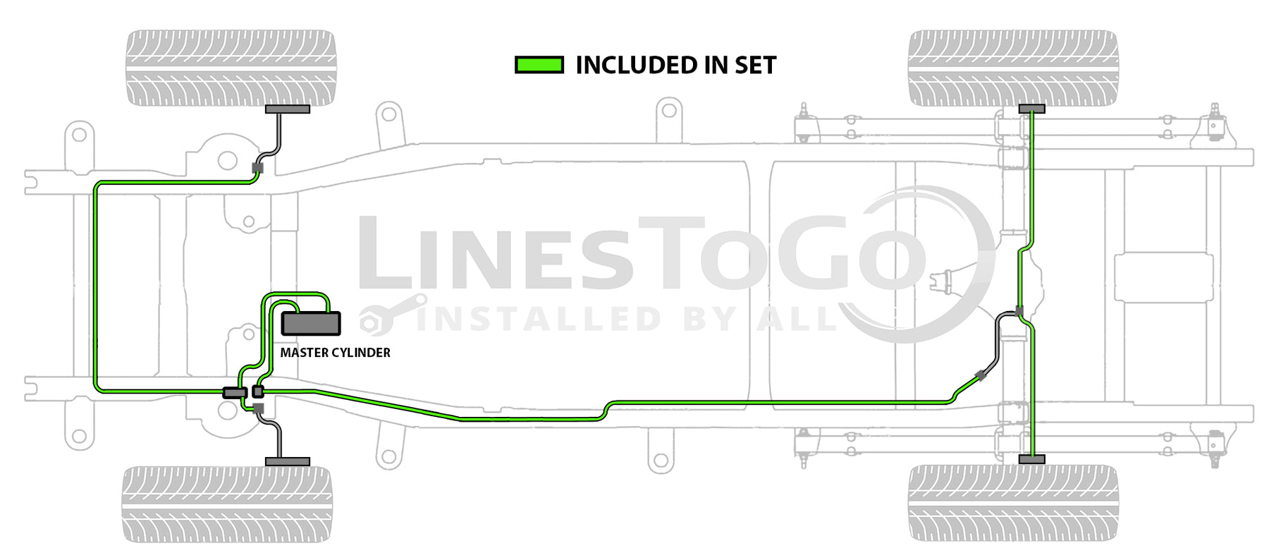 1 Master Cylinder Primary Brake Line 3/16", 1 Master Cylinder Secondary Brake Line 3/16", 1 Left Front Brake Line 3/16", 1 Right Front Brake Line 3/16", 1 Intermediate Brake Line 3/16" (in 3 easy to install sections), 1 Rear Axle Crossover Line 3/16" (2 sections), Does NOT include Brake Hoses