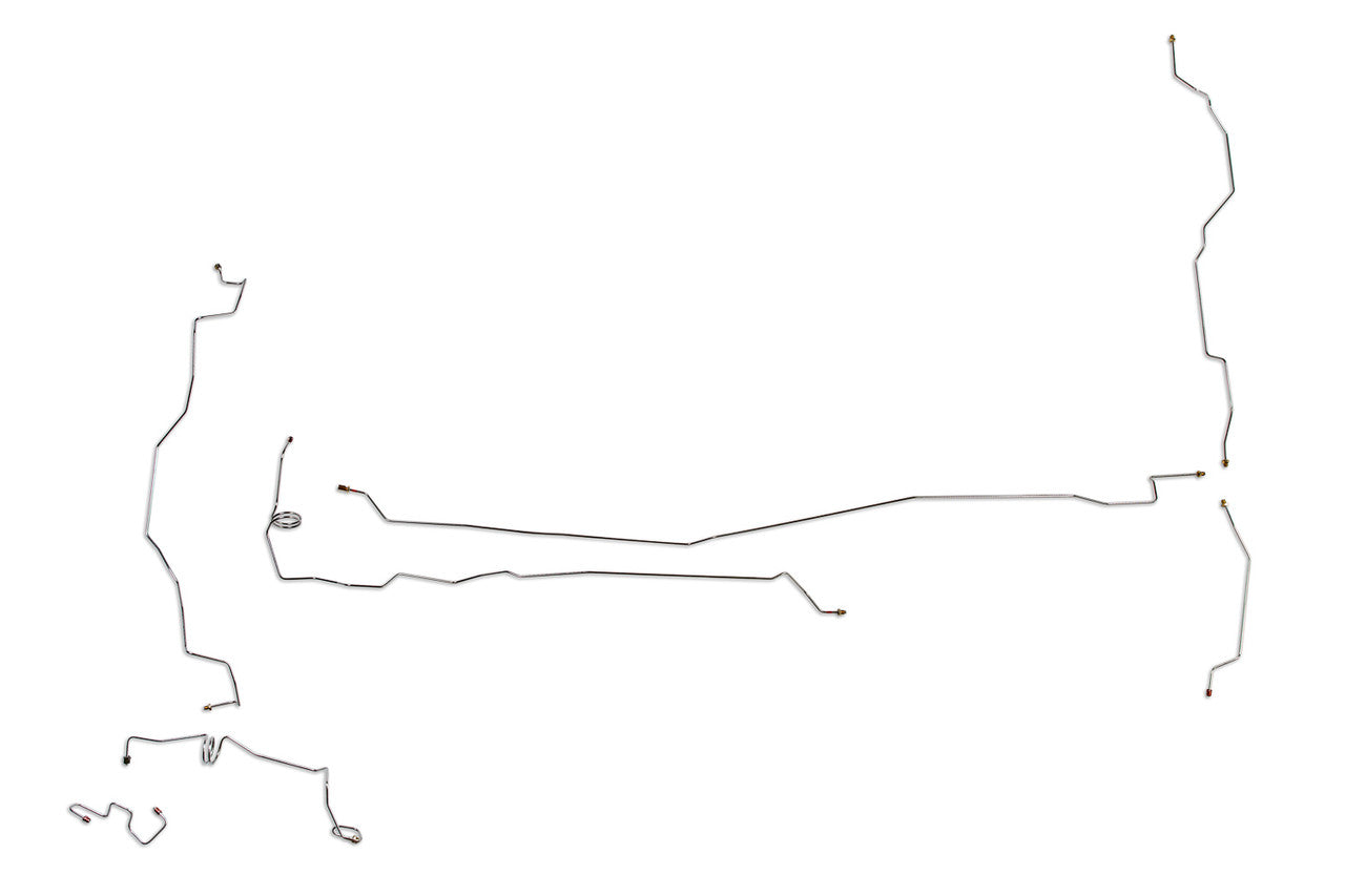 1 Master Cylinder Primary Brake Line 3/16", 1 Master Cylinder Secondary Brake Line 3/16", 1 Right Front Brake Line 3/16", 1 Intermediate Brake Line 3/16" (in 2 easy to install sections), 1 Rear Axle Crossover Line (2 sections), Does NOT include Brake Hoses