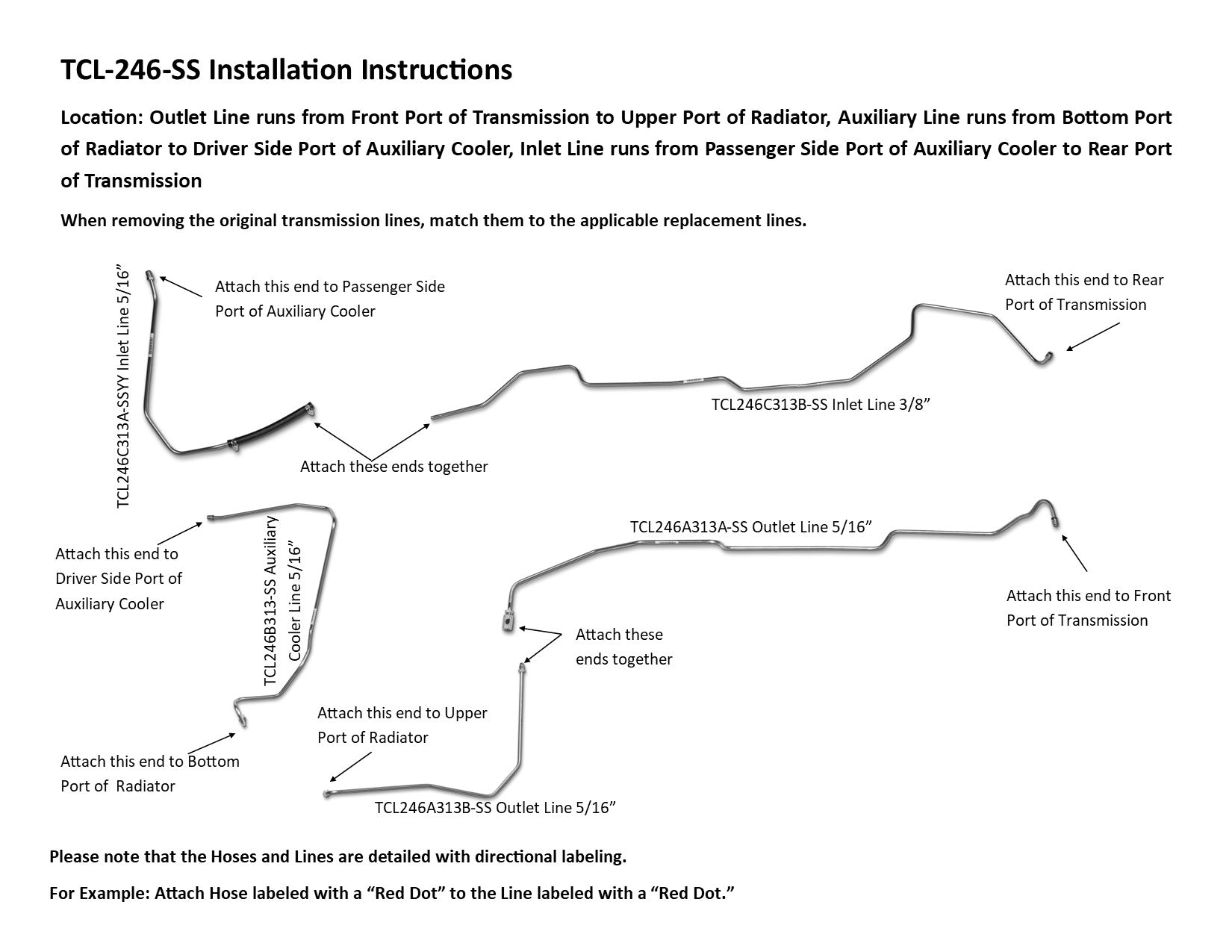 Outlet Line runs from Front Port of Transmission to Upper Port of Radiator, Auxiliary Line runs from Bottom Port of Radiator to Driver Side Port of Auxiliary Cooler, Inlet Line runs from Passenger Side Port of Auxiliary Cooler to Rear Port of Transmission