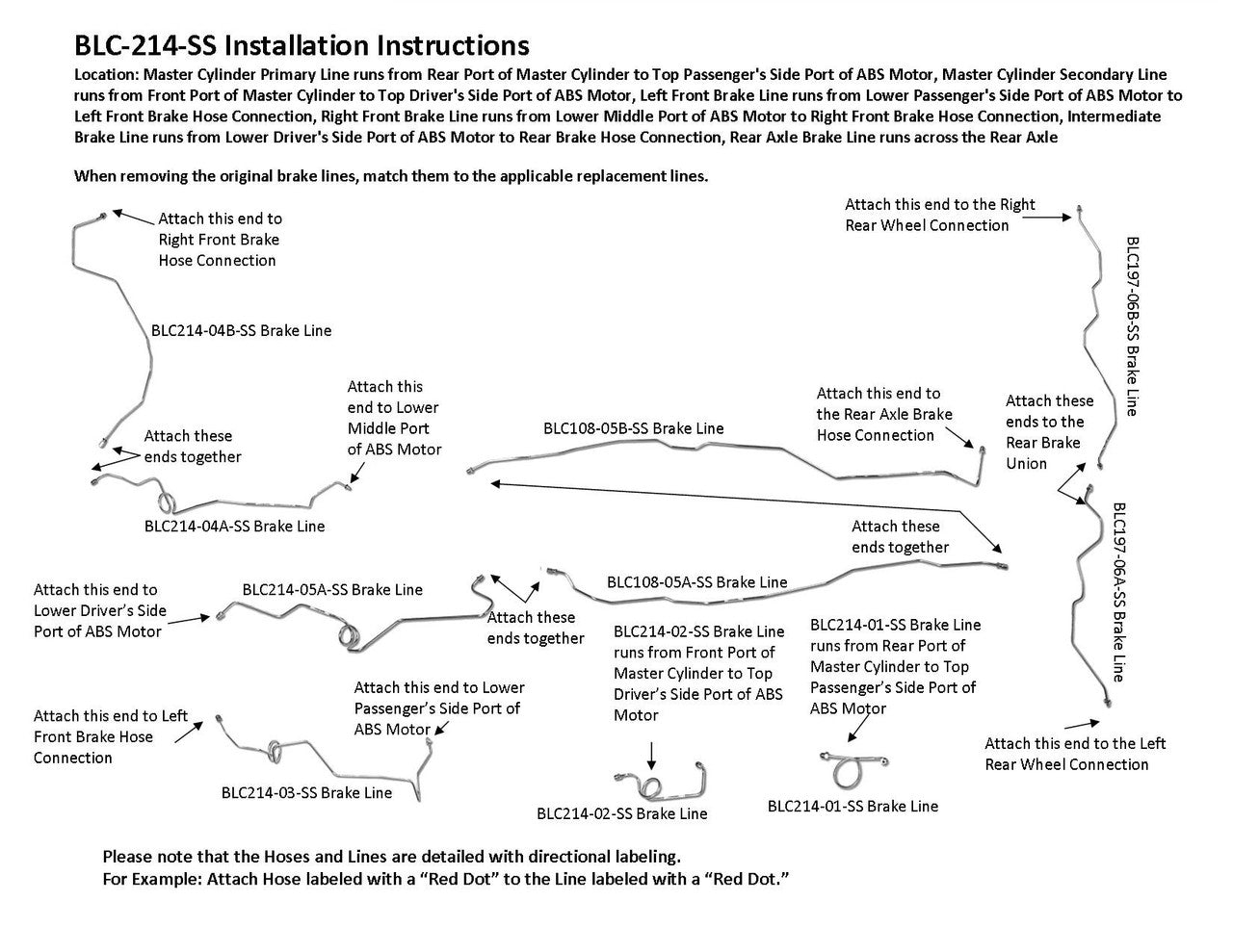 Master Cylinder Primary Line runs from Rear Port of Master Cylinder to Top Passenger's Side Port of ABS Motor, Master Cylinder Secondary Line runs from Front Port of Master Cylinder to Top Driver's Side Port of ABS Motor, Left Front Brake Line runs from Lower Passenger's Side Port of ABS Motor to Left Front Brake Hose Connection, Right Front Brake Line runs from Lower Middle Port of ABS Motor to Right Front Brake Hose Connection, Intermediate Brake Line runs from Lower Driver's Side Port of ABS Motor to Rear Brake Hose Connection, Rear Axle Brake Line runs across the Rear Axle