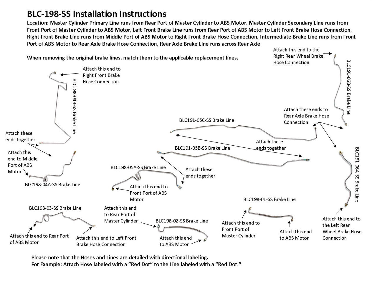 Master Cylinder Primary Line runs from Rear Port of Master Cylinder to ABS Motor, Master Cylinder Secondary Line runs from Front Port of Master Cylinder to ABS Motor, Left Front Brake Line runs from Rear Port of ABS Motor to Left Front Brake Hose Connection, Right Front Brake Line runs from Middle Port of ABS Motor to Right Front Brake Hose Connection, Intermediate Brake Line runs from Front Port of ABS Motor to Rear Axle Brake Hose Connection, Rear Axle Brake Line runs across Rear Axle