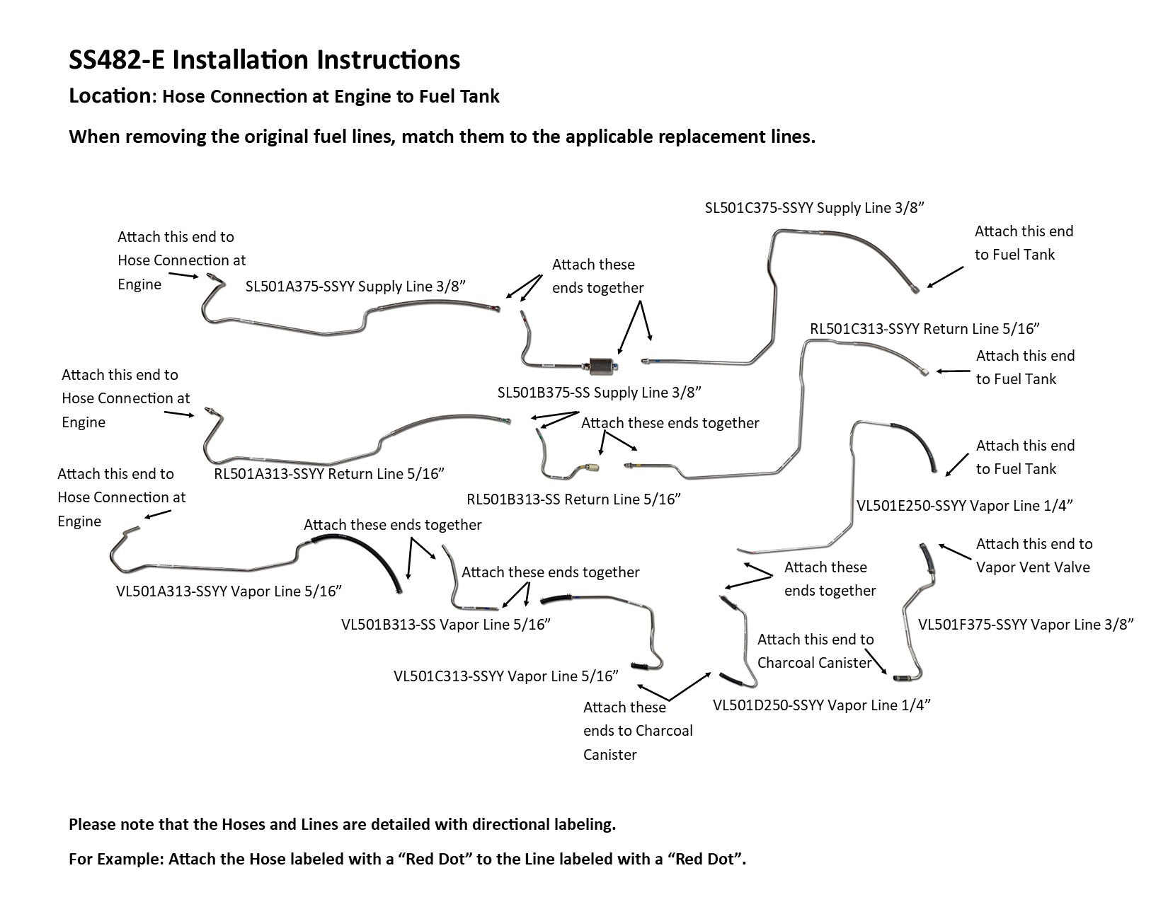 1 Supply Line 3/8" (in 3 easy to install sections), 1 Return Line 5/16" (in 2 easy to install sections), 1 Return Line 5/16", 1 Vapor Line 5/16" (in 2 easy to install sections), 1 Vapor Line 5/16", 1 Vapor Line 1/4", 1 Vapor Line 1/4", 1 Vapor Line 3/8", 1 Fuel Filter
