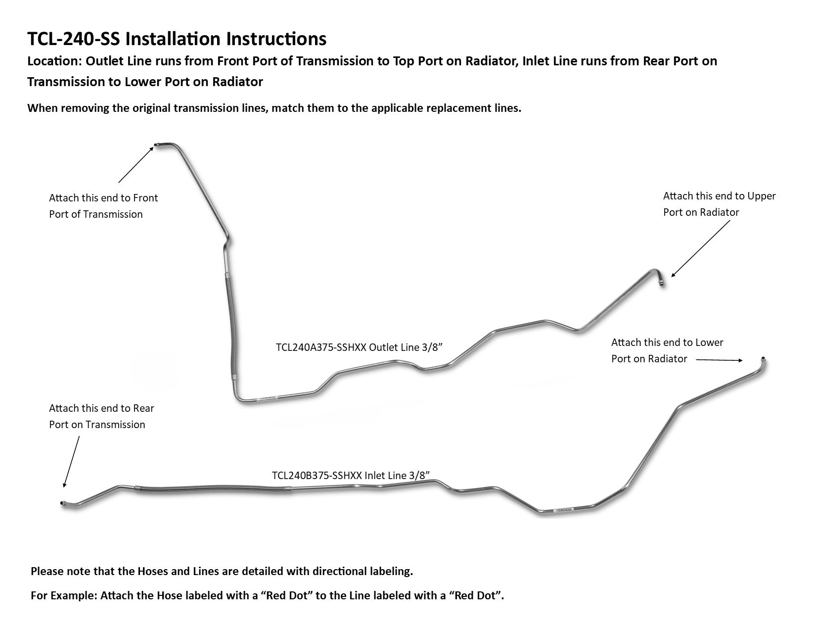 Outlet Line runs from Front Port of Transmission to Top Port on Radiator, Inlet Line runs from Rear Port on Transmission to Lower Port on Radiator