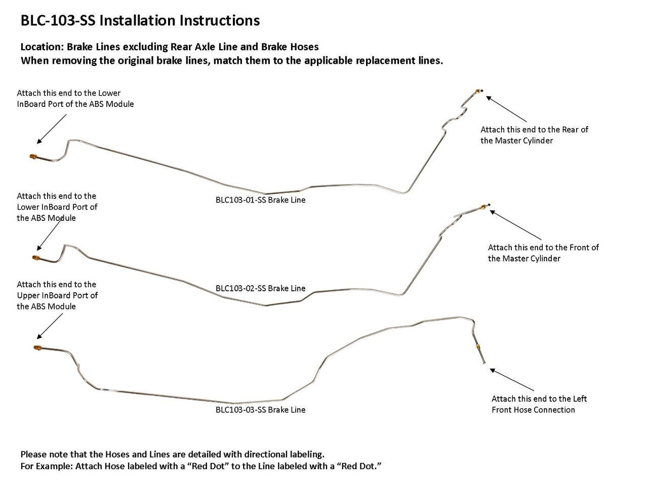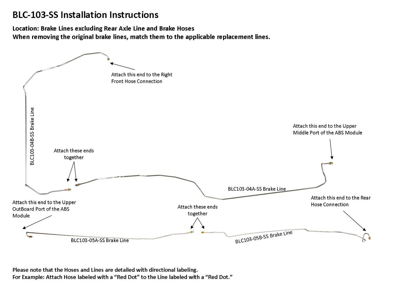 Please Note: Before installing your brake line, a shipping bend will need to be removed from the lines labeled BLC103-01-SS, BLC103-02-SS, BLC103-03-SS, BLC-103-04A-SS, BLC103-04B-SS, BLC103-05A-SS, and BLC103-05B-SS. See the video below on how to remove the shipping bend