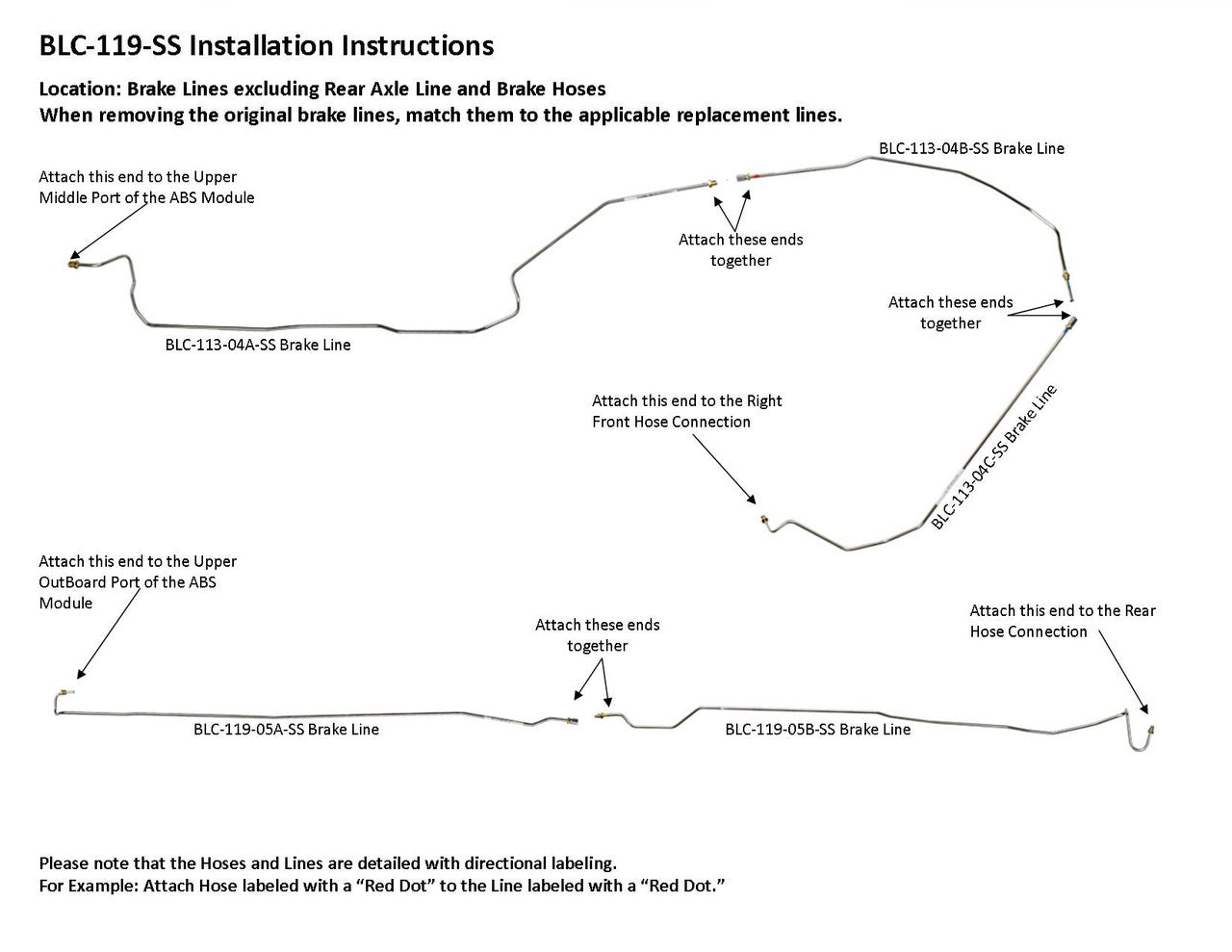 1 Master Cylinder Primary Line from Rear of Master Cylinder to Lower Inboard Port of ABS Module, 1 Master Cylinder Secondary Line from Front of Master Cylinder to Lower Outboard Port of ABS Module, Left Front Line from Hose Connection to Upper Inboard Port of ABS, Right Front Line from Hose Connection to Upper Middle Port of ABS (3 easy to install sections), Rear Line from Hose Connection to Upper Outboard Port of ABS Module (2 easy to install section), Excludes Rear Axle Crossover Line