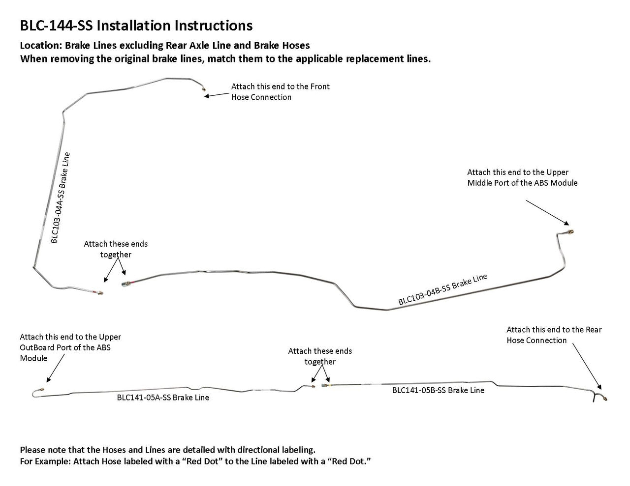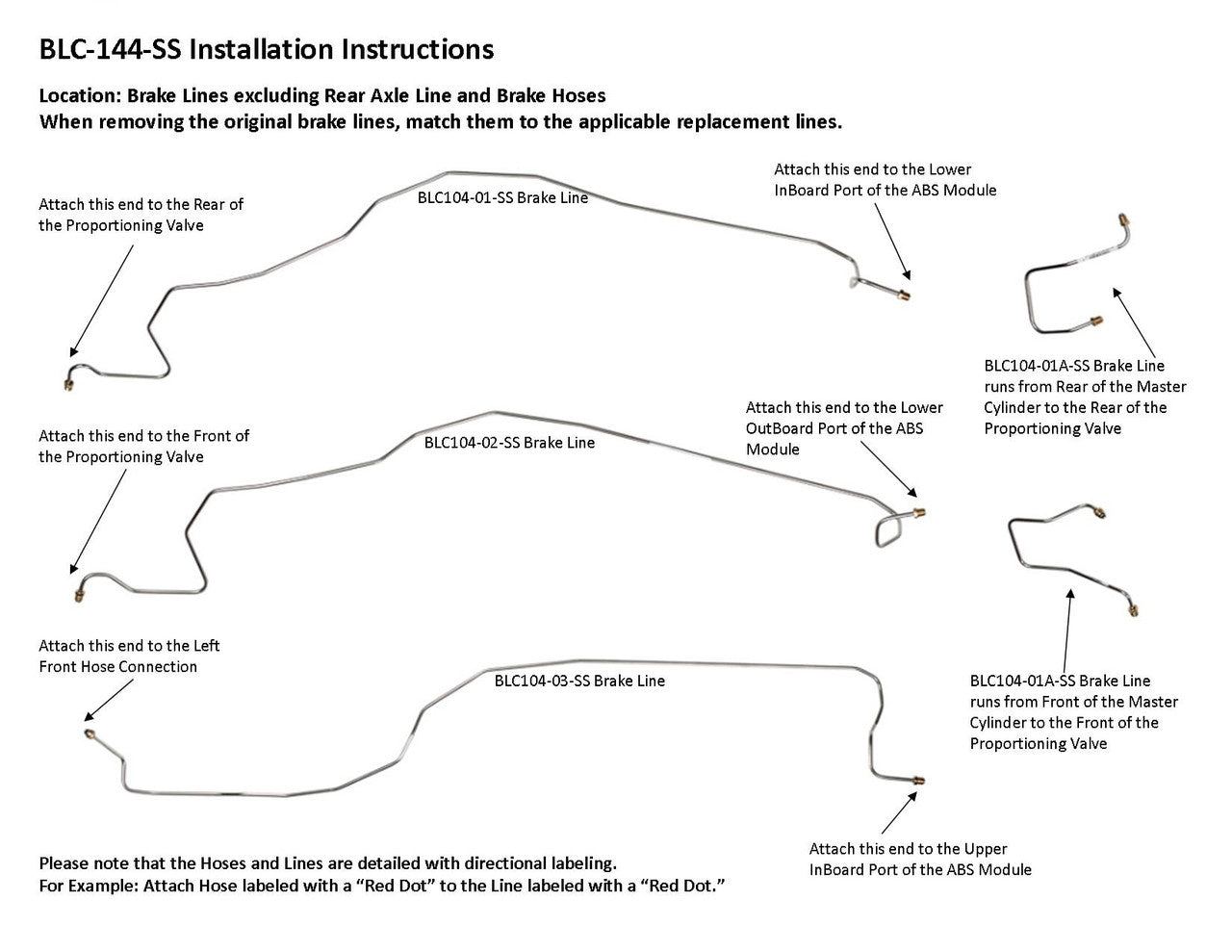 1 Master Cylinder Primary Line from Rear of Proportioning Valve to Lower InBoard Port of ABS Module, 1 Master Cylinder Primary Line from Rear of the Master Cylinder to Rear of the Portioning Valve, 1 Master Cylinder Secondary Line from Front of Proportioning Valve to Lower Outboard of ABS Module, 1 Master Cylinder Secondary Line from Front of Master Cylinder to Front of Proportioning Valve, 1 Left Front Line from Front Hose Connection to Upper Inboard Port of ABS Module, 1 Right Front Line from Front Hose Connection to Upper Middle Port in from Center of ABS Module (2 easy to install sections),1 Rear Line from Rear Hose Connection to Upper Outboard Port of ABS Module (2 easy to install sections) excludes Rear Axle Crossover Line