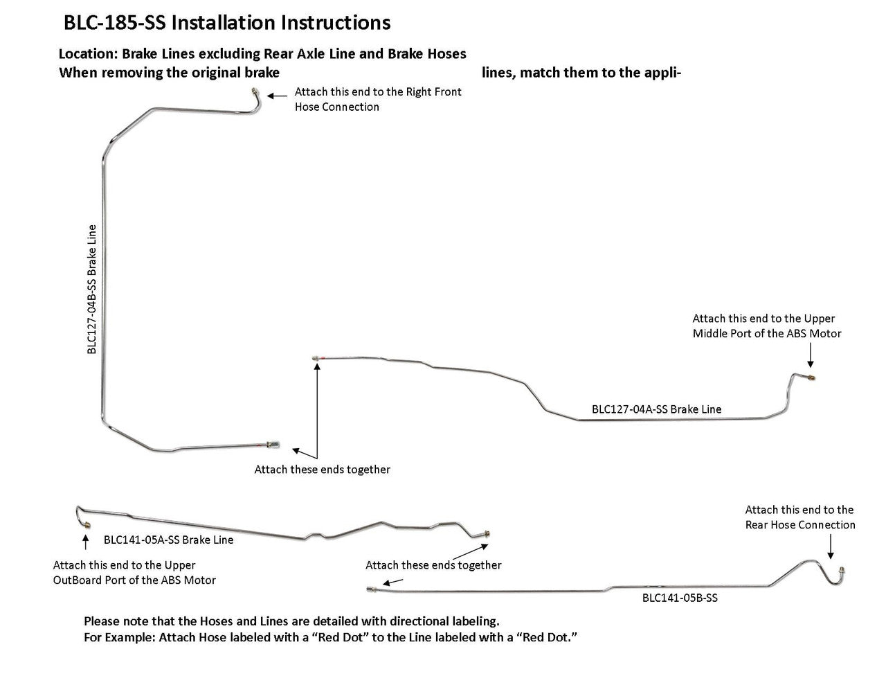 1 Master Cylinder Primary Line from Rear of Master Cylinder to Lower Inboard Port of ABS Module, 1 Master Cylinder Secondary Line from Front of Master Cylinder to Lower Outboard Port of ABS Module, 1 Left Front Line from Upper Inboard Port of ABS Motor to Left Front Wheel Hose Connection, 1 Right Front Line from Upper Middle Port of ABS Motor to the Right Front Wheel Connection (2 easy to install sections), 1 Rear Line from Rear Hose Connection to Upper Outboard Port of ABS Module (2 easy to install sections), excludes Rear Axle Line
