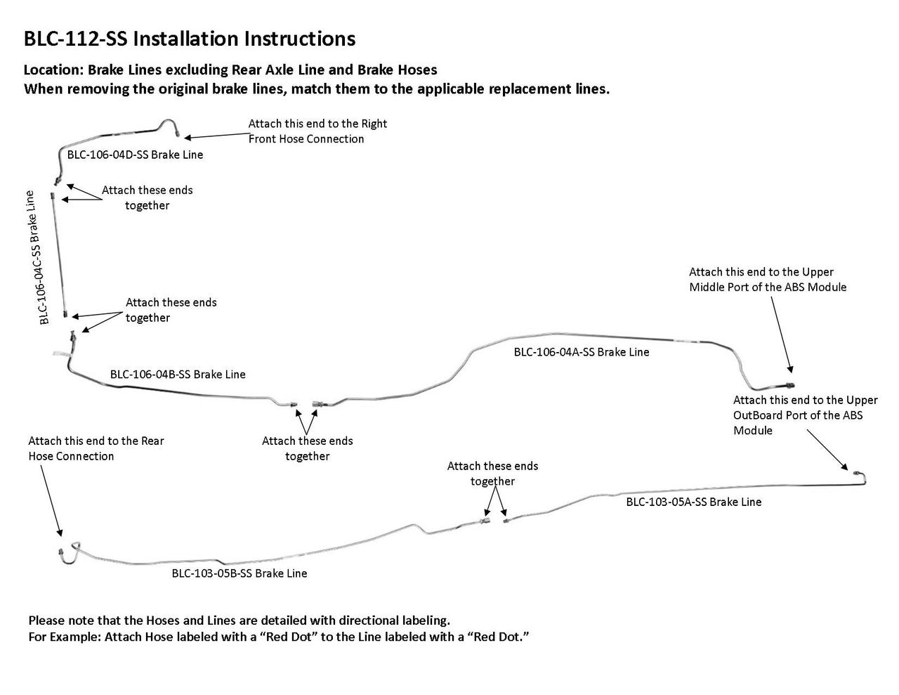 Please Note: Before installing your brake line, a shipping bend will need to be removed from the lines labeled BLC104-01-SS, BLC104-02-SS, BLC106-03-SS, BLC106-04A-SS, BLC103-05A-SS, and BLC103-05B-SS. See the video below on how to remove the shipping bend