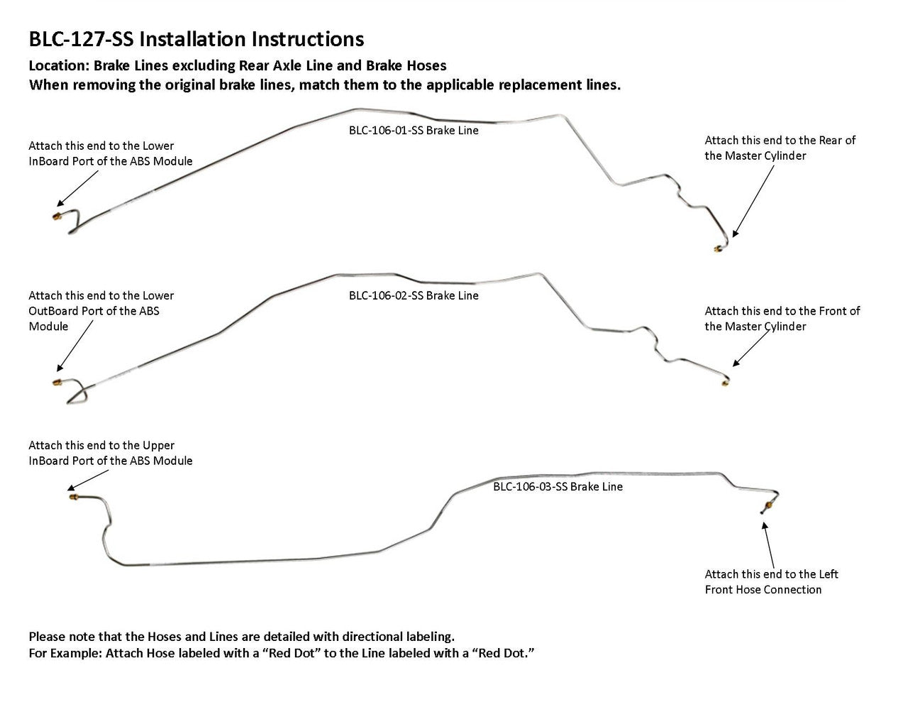 Please Note: Before installing your brake line, a shipping bend will need to be removed from the lines labeled BLC106-01-SS, BLC106-02-SS, BLC106-03-SS, BLC127-04A-SS, and BLC127-04B-SS. See the video below on how to remove the shipping bend