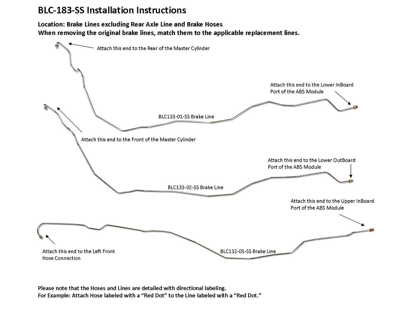 1 Primary Line from rear of Master Cylinder to Lower Inboard Port of ABS, 1 Secondary Line from Front of Master Cylinder to Lower Inboard Port of ABS, 1 Left Front Line from Upper Inboard Port of ABS Motor to Left Front Wheel Hose Connection, 1 Right Front Line from Upper Middle Port of ABS Motor to the Right Front Wheel Connection (2 easy to install sections), 1Rear Line from rear Hose Connection to Upper Outboard Port of ABS Module (2 easy to install sections), excludes Rear Axle Line