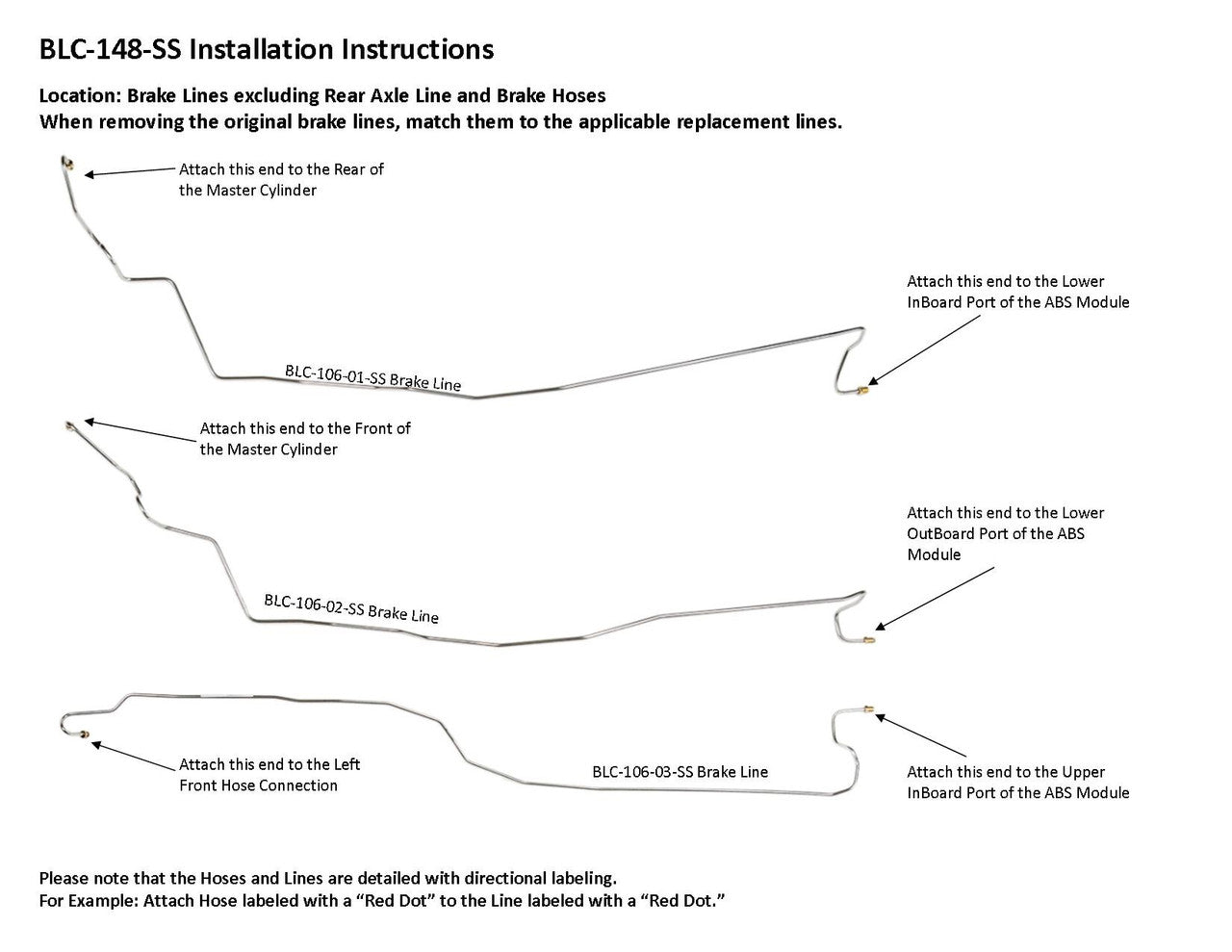 1 Master Cylinder Primary Line from Rear of Master Cylinder to Lower Inboard Port of ABS Module, 1 Master Secondary Line from Front of Master Cylinder to Lower Outboard Port of the ABS Module, Left Front Line from Hose Connection to Upper Inboard Port on the ABS Module, Right Front Line From Hose Connection to Upper Middle Port of the ABS Module (3 easy to install sections), Rear Line from Hose Connection to Upper Outboard Port of the ABS Module (2 easy to install sections), Excludes Rear Axle Crossover Line