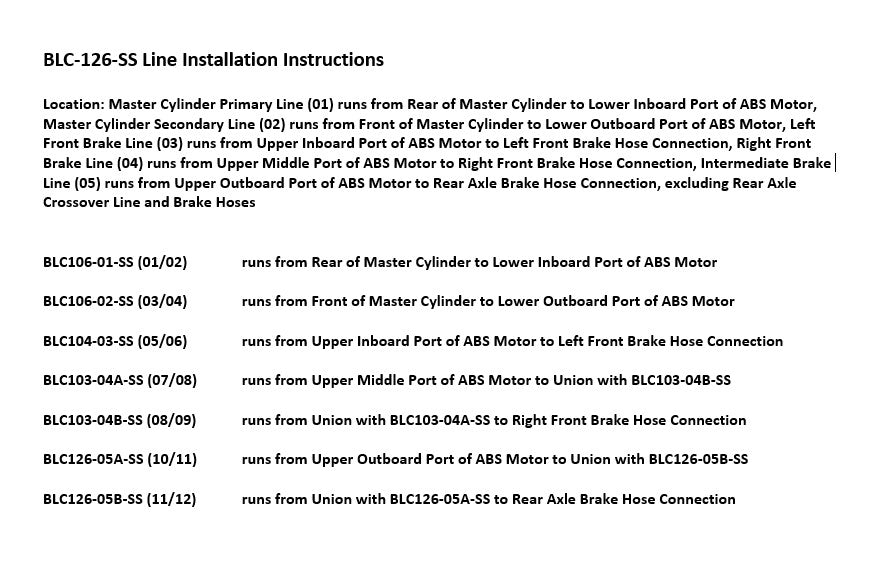 1 Master Cylinder Primary Line from Rear of Master Cylinder to Lower Inboard Port of ABS Module, 1 Master Cylinder Secondary Line from Front of Master Cylinder to Lower Outboard Port of ABS Module, 1 Left Front Line from Left Front Hose Connection to Upper Inboard Port of ABS Module, 1 Right Front Line from Right Front Hose Connection to Upper Middle Port of ABS Module (2 easy to install sections), 1 Rear Line from Rear Hose Connection to Upper Outboard Port of ABS Module (2 easy to install sections)