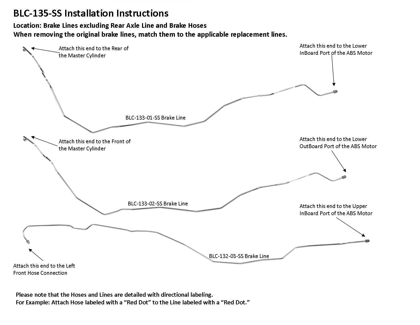 1 Master Cylinder Primary Line from Rear of Master Cylinder to Lower Inboard Port of ABS Motor, 1 Master Cylinder Secondary Line from Front of Master Cylinder to Lower Outboard Port of ABS Motor, 1 Left Front Line from Left Front Hose Connection to Upper Inboard Port of ABS Motor, 1 Right Front Line from Right Front Hose Connection to Upper Middle Port of ABS Motor (2 easy to install sections), 1 Rear Line from Rear Hose Connection to Upper Outboard Port of ABS Motor (2 easy to install sections)