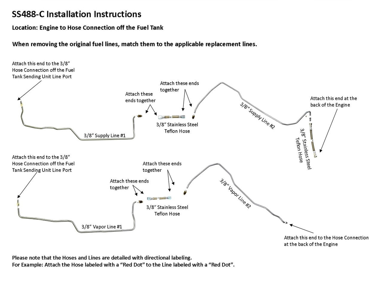 1 supply line 3/8" ( in 2 easy to install sections), 1 vapor line 3/8" ( in 2 easy to install sections), hoses to join rear and front sections, hose to engine connection