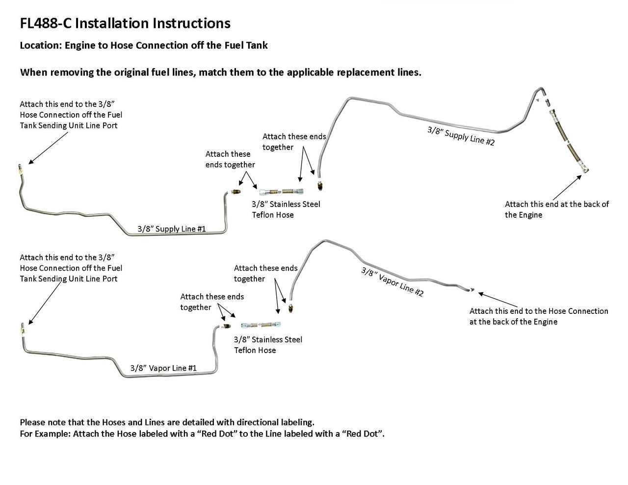 1 supply line 3/8" ( in 2 easy to install sections), 1 vapor line 3/8" ( in 2 easy to install sections), hoses to join rear and front sections, hose to engine connection