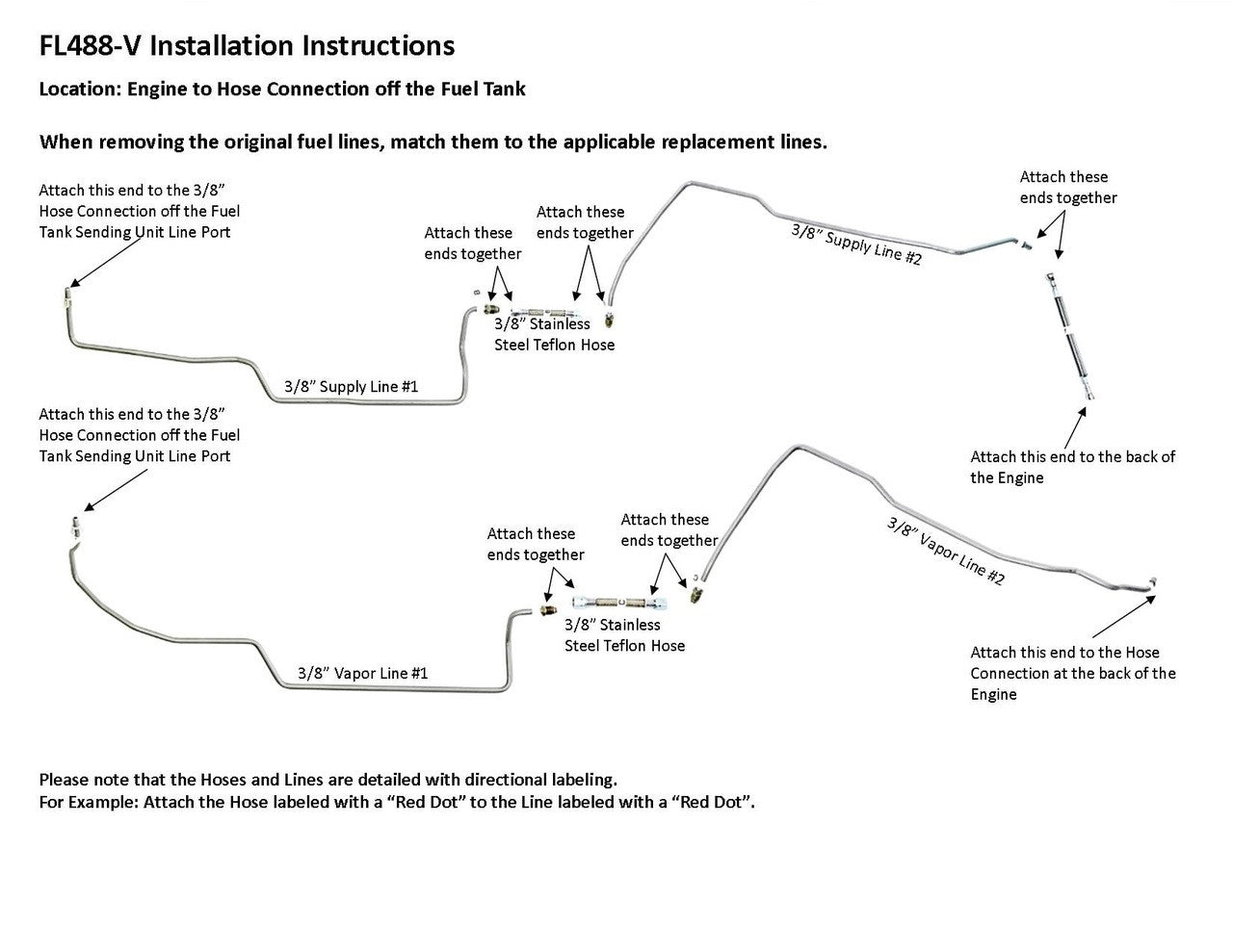 1 supply line 3/8" ( in 2 easy to install sections), 1 vapor line 3/8" ( in 2 easy to install sections), hose to engine connection, hoses to join rear and front sections