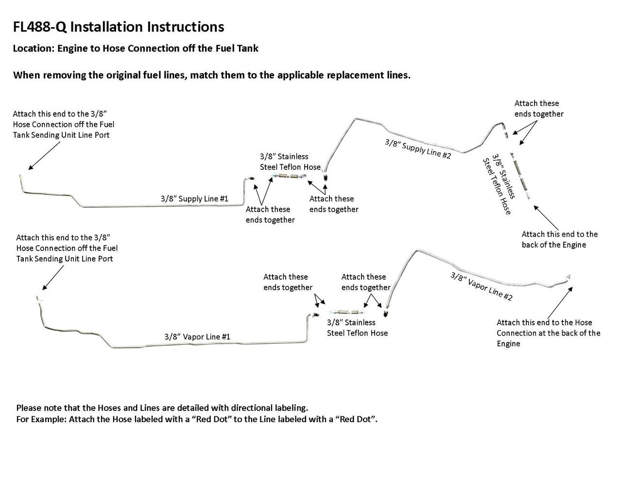 1 supply line 3/8" ( in 2 easy to install sections), 1 vapor line 3/8" ( in 2 easy to install sections), hose to engine connection, hoses to join rear and front sections