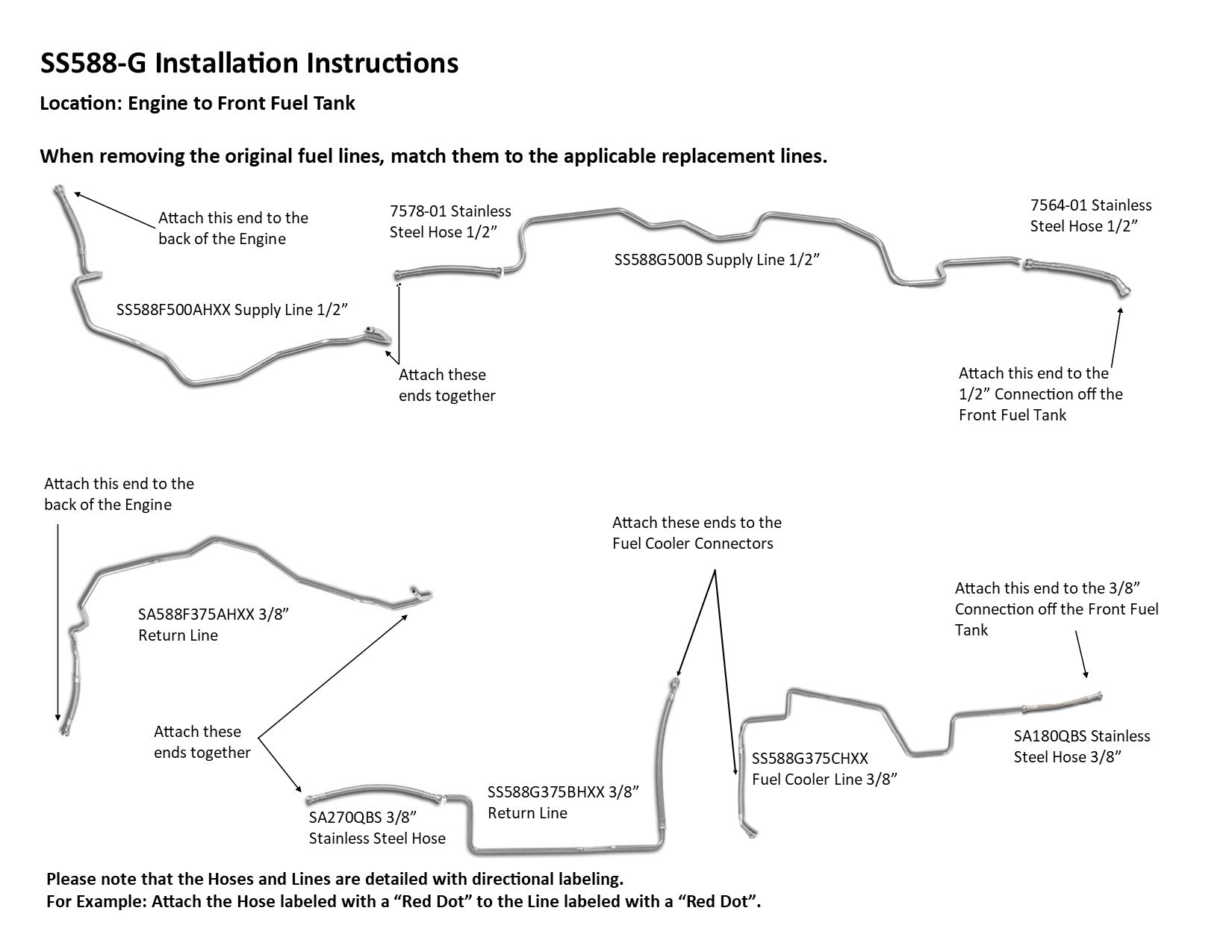 1 supply line 1/2" ( in 3 easy to install sections), 1 return line 3/8" ( in 2 easy to install sections), 1 fuel cooler line 3/8", hoses to engine connection, hoses to join rear and front sections, hoses to fuel cooler connection