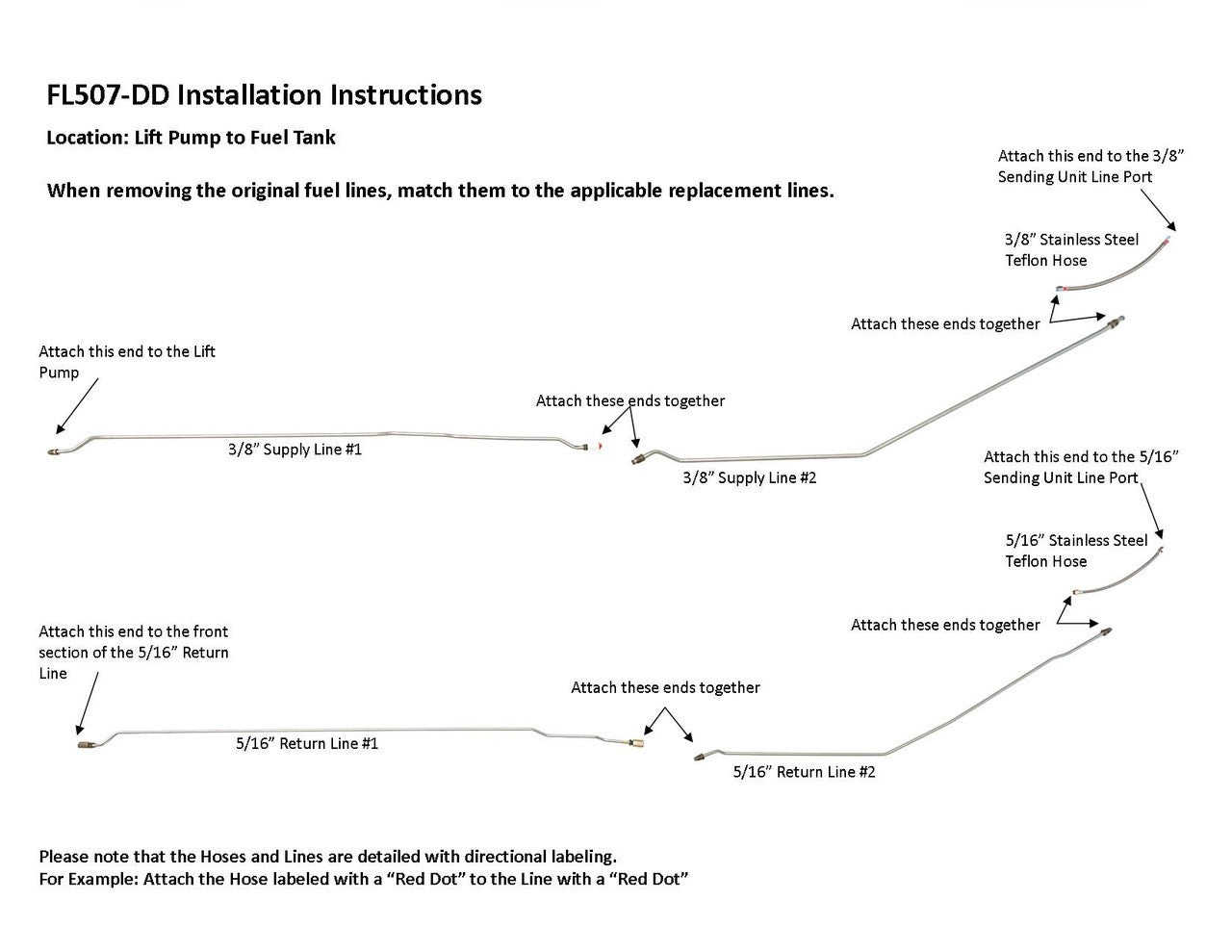 1 supply line 3/8" ( in 2 easy to install sections), 1 return line 5/16" ( in 2 easy to install sections), hoses to sending unit connection, 3 unions