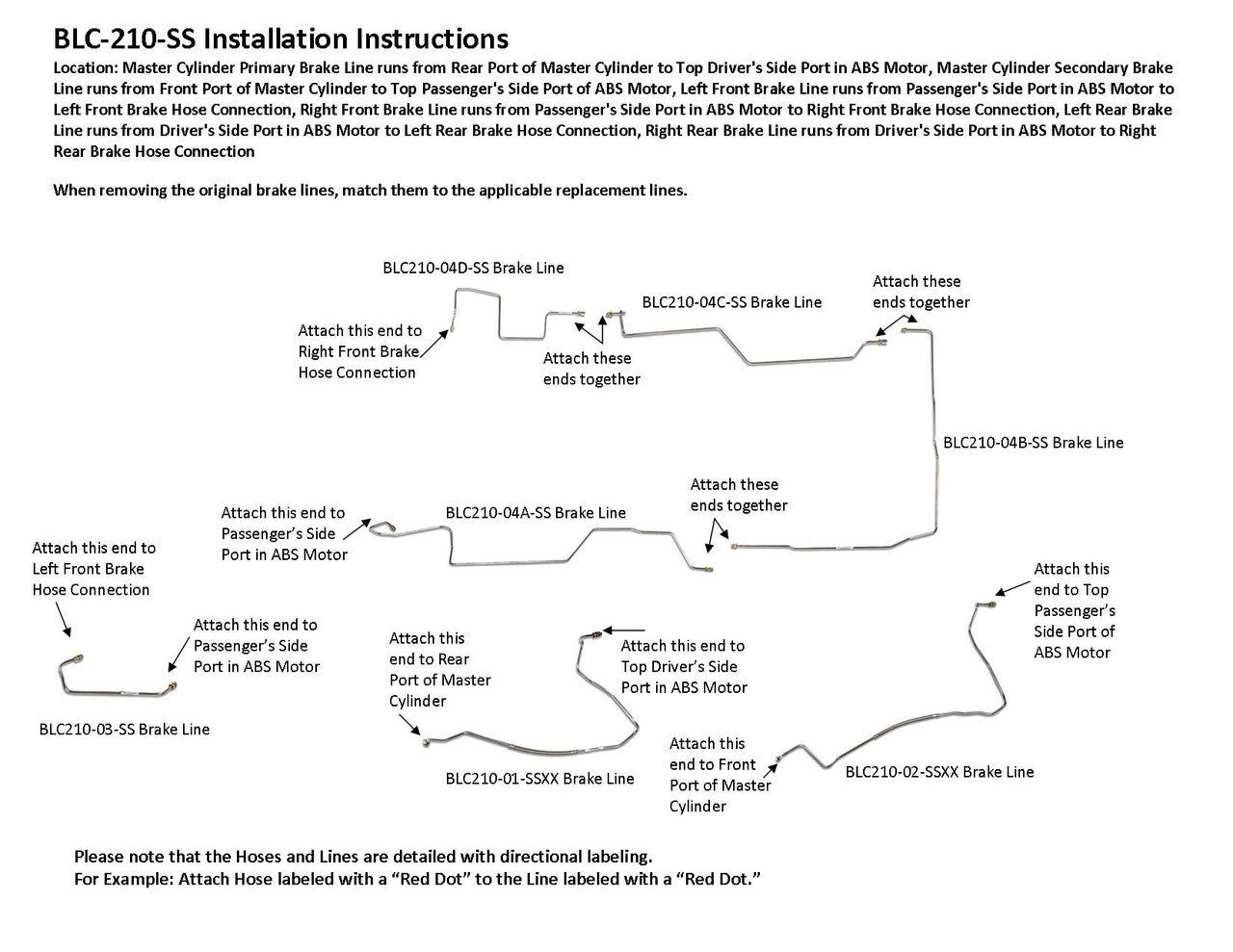 Master Cylinder Primary Brake Line runs from Rear Port of Master Cylinder to Top Driver's Side Port in ABS Motor, Master Cylinder Secondary Brake Line runs from Front Port of Master Cylinder to Top Passenger's Side Port of ABS Motor, Left Front Brake Line runs from Passenger's Side Port in ABS Motor to Left Front Brake Hose Connection, Right Front Brake Line runs from Passenger's Side Port in ABS Motor to Right Front Brake Hose Connection, Left Rear Brake Line runs from Driver's Side Port in ABS Motor to Left Rear Brake Hose Connection, Right Rear Brake Line runs from Driver's Side Port in ABS Motor to Right Rear Brake Hose Connection