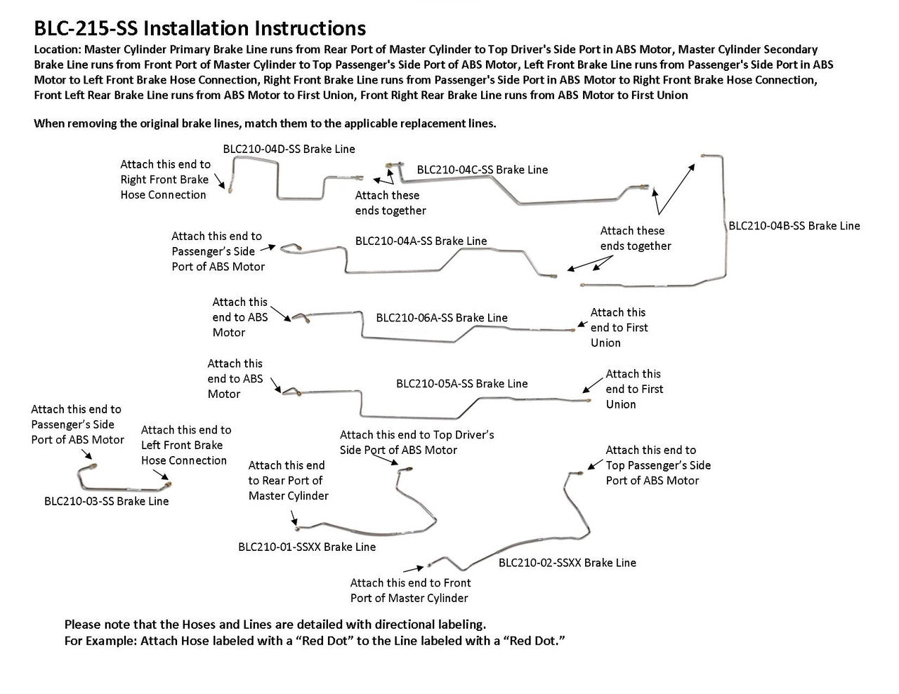 Master Cylinder Primary Brake Line runs from Rear Port of Master Cylinder to Top Driver's Side Port in ABS Motor, Master Cylinder Secondary Brake Line runs from Front Port of Master Cylinder to Top Passenger's Side Port of ABS Motor, Left Front Brake Line runs from Passenger's Side Port in ABS Motor to Left Front Brake Hose Connection, Right Front Brake Line runs from Passenger's Side Port in ABS Motor to Right Front Brake Hose Connection, Front Left Rear Brake Line runs from ABS Motor to First Union, Front Right Rear Brake Line runs from ABS Motor to First Union