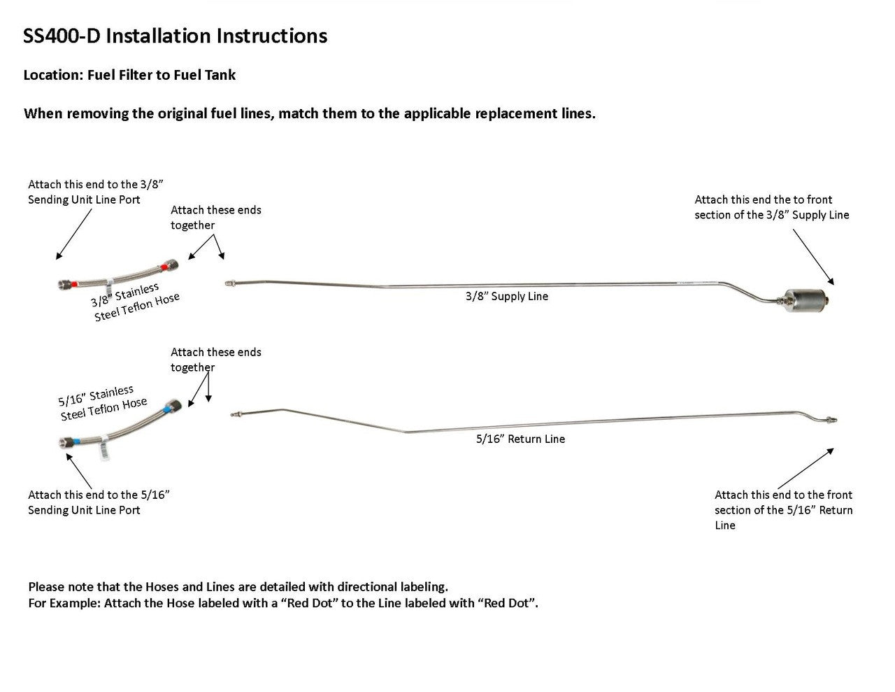 1 supply line 3/8", 1 return line 5/16", hoses to sending unit connection, 1 fuel filter