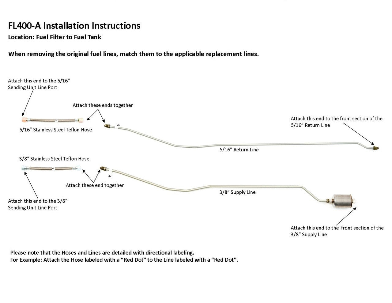 1 supply line 3/8", 1 return line 5/16", hoses to sending unit connection, 1 fuel filter