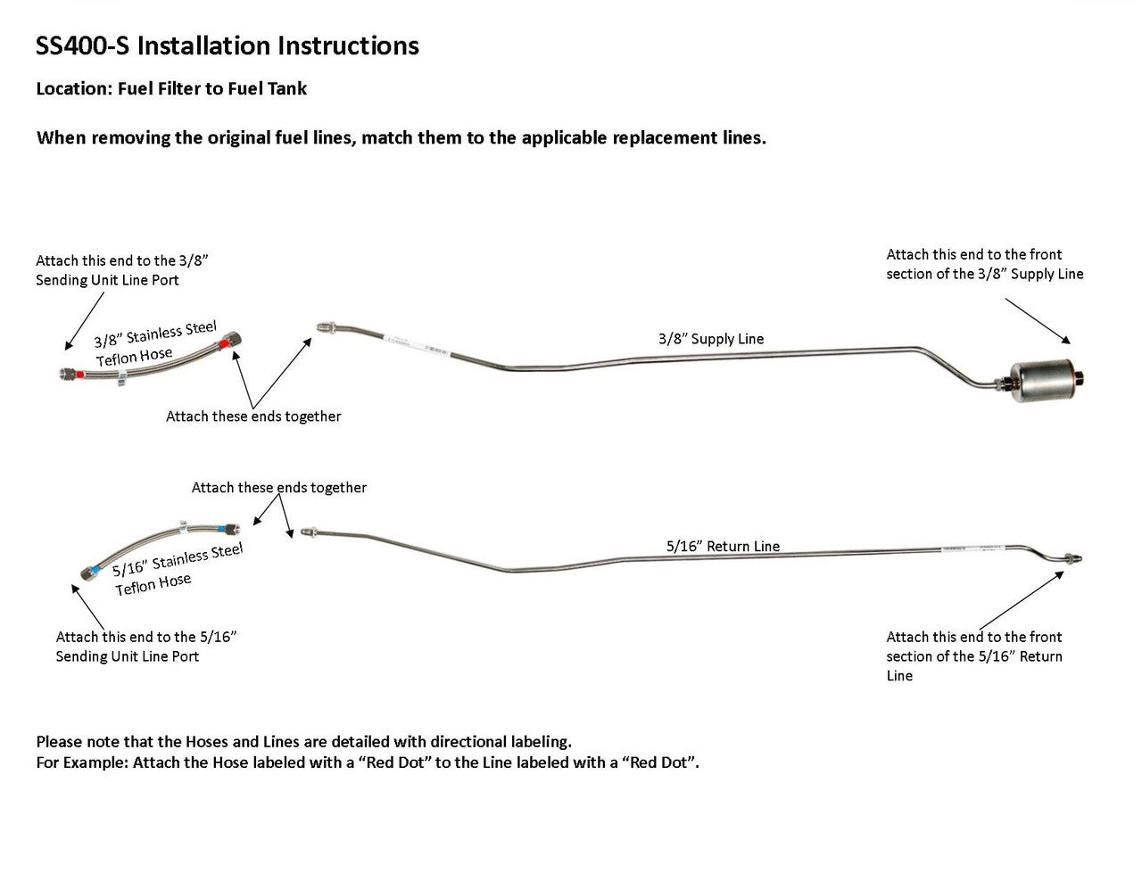 1 supply line 3/8", 1 return line 5/16", hoses to sending unit connection, 1 fuel filter