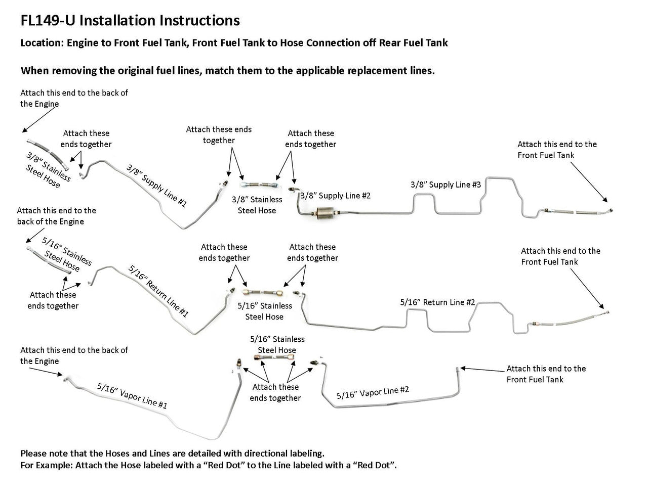 Front Section: 1 supply line 3/8" ( in 3 easy to install sections), 1 return line 5/16"( in 2 easy to install sections), 1 vapor line 5/16" ( in 2 easy to install sections), hoses to engine connection, hoses to join rear, intermediate, and front sections, nylon line. Rear Section: 1 supply line 3/8", 1 vapor line (in 4 sections)