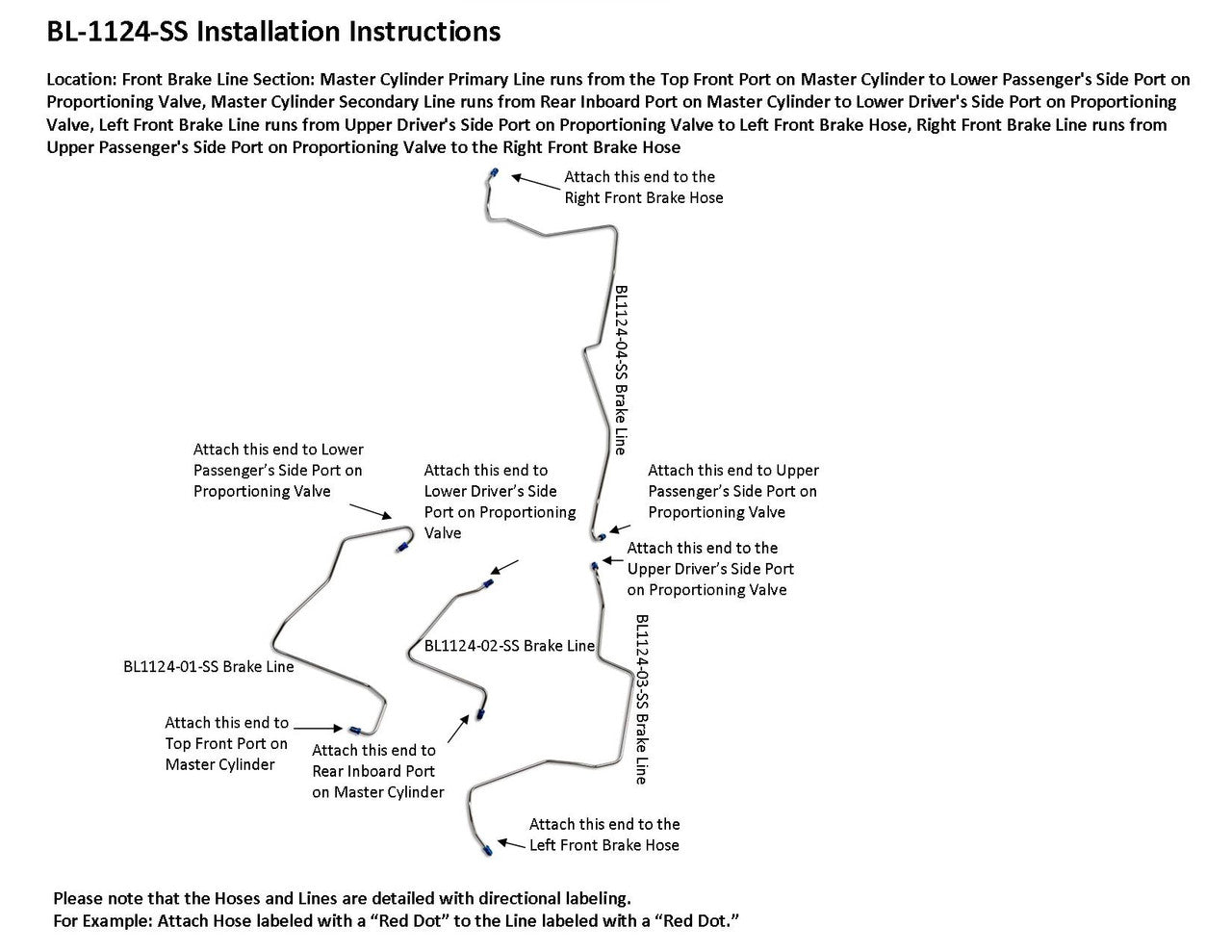 Front Brake Line Section: Master Cylinder Primary Line runs from the Top Front Port on Master Cylinder to Lower Passenger's Side Port on Proportioning Valve, Master Cylinder Secondary Line runs from Rear Inboard Port on Master Cylinder to Lower Driver's Side Port on Proportioning Valve, Left Front Brake Line runs from Upper Driver's Side Port on Proportioning Valve to Left Front Brake Hose Connection, Right Front Brake Line runs from Upper Passenger's Side Port on Proportioning Valve to the Right Front Brake Hose Connection