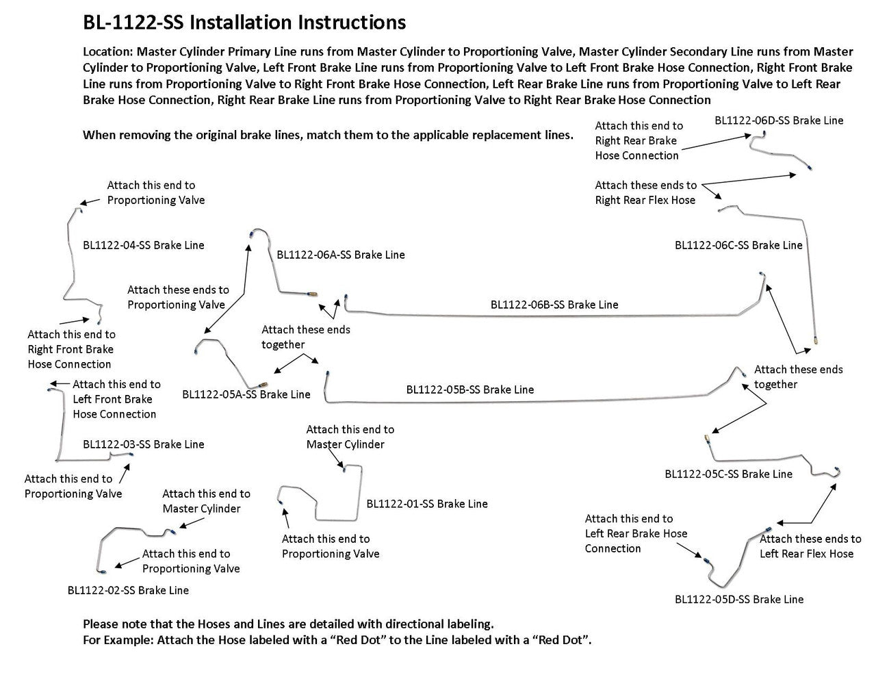 Master Cylinder Primary Line runs from Master Cylinder to Proportioning Valve, Master Cylinder Secondary Line runs from Master Cylinder to Proportioning Valve, Left Front Brake Line runs from Proportioning Valve to Left Front Brake Hose Connection, Right Front Brake Line runs from Proportioning Valve to Right Front Brake Hose Connection, Left Rear Brake Line runs from Proportioning Valve to Left Rear Brake Hose Connection, Right Rear Brake Line runs from Proportioning Valve to Right Rear Brake Hose Connection