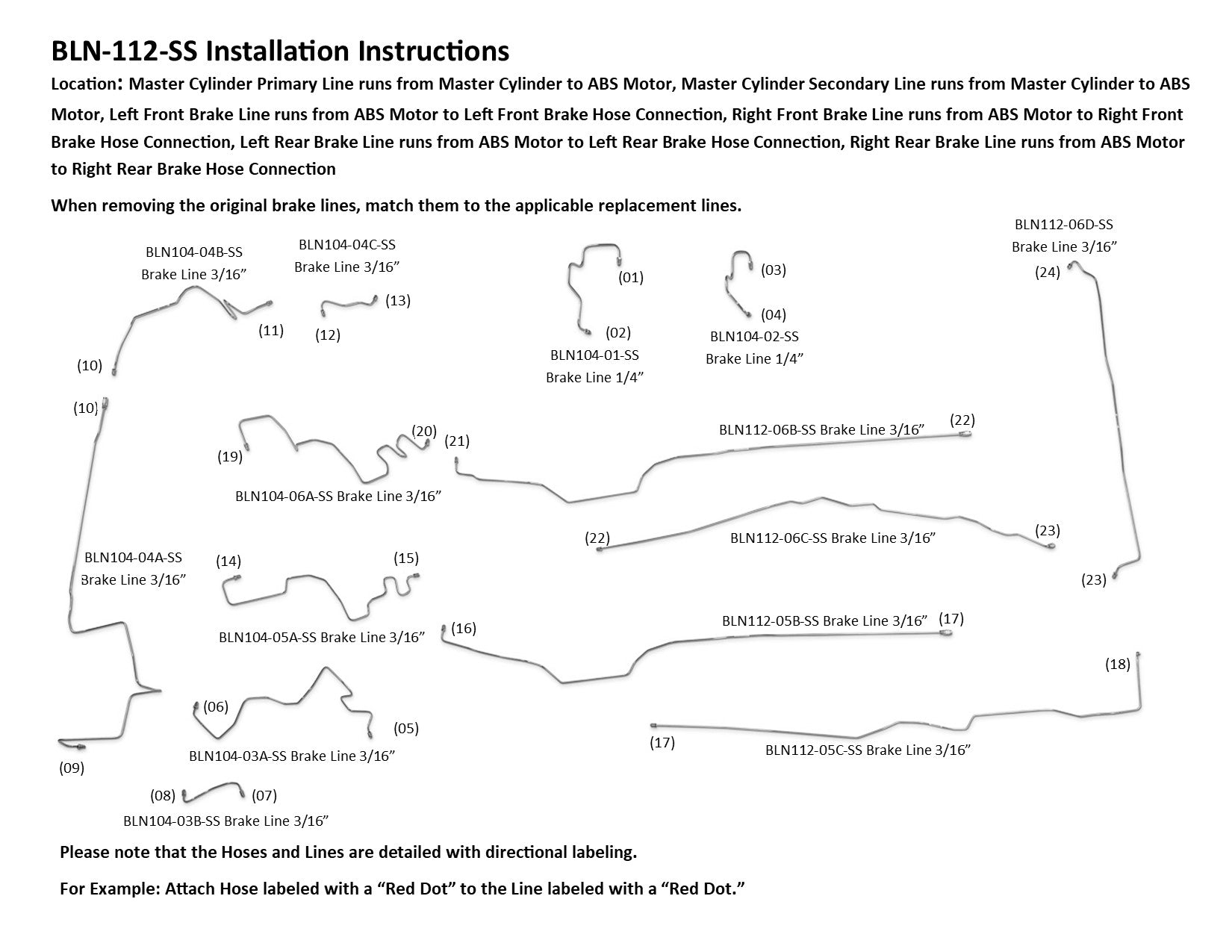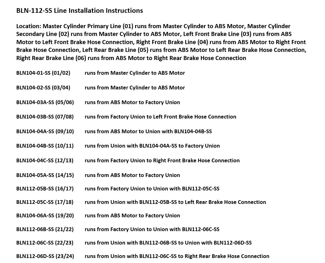 Please Note: Before installing your brake lines, a shipping bend will need to be removed from the lines labeled BLN112-05B-SS, BLN112-05C-SS and BLN112-06B-SS. See the video below on how to remove the shipping bend