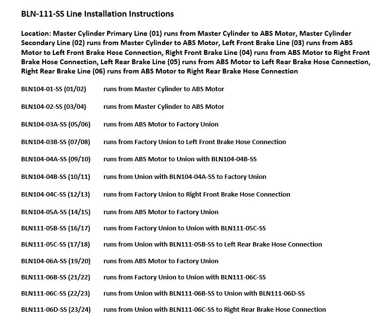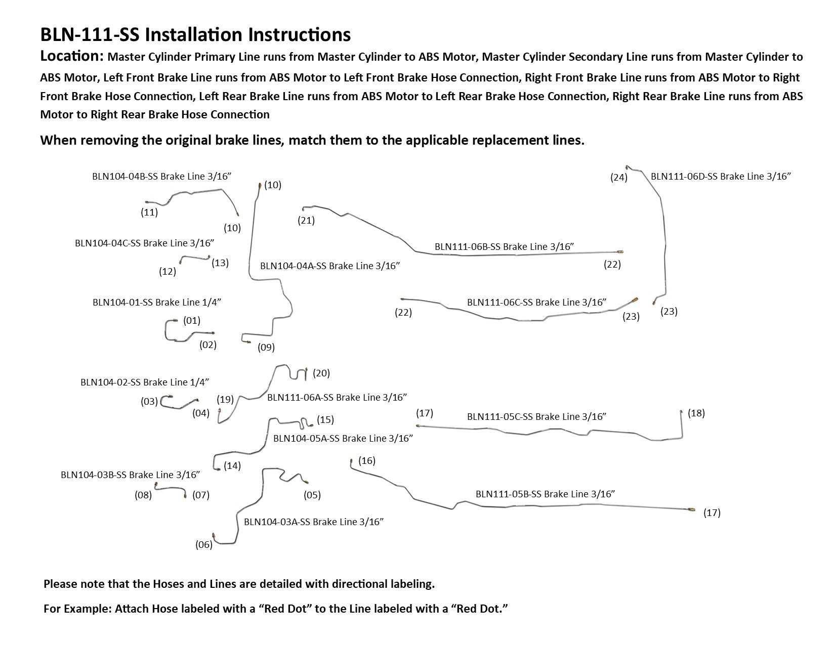 Please Note: Before installing your brake lines, a shipping bend will need to be removed from the lines labeled BLN111-05B-SS, BLN111-05C-SS and BLN111-06B-SS. See the video below on how to remove the shipping bend