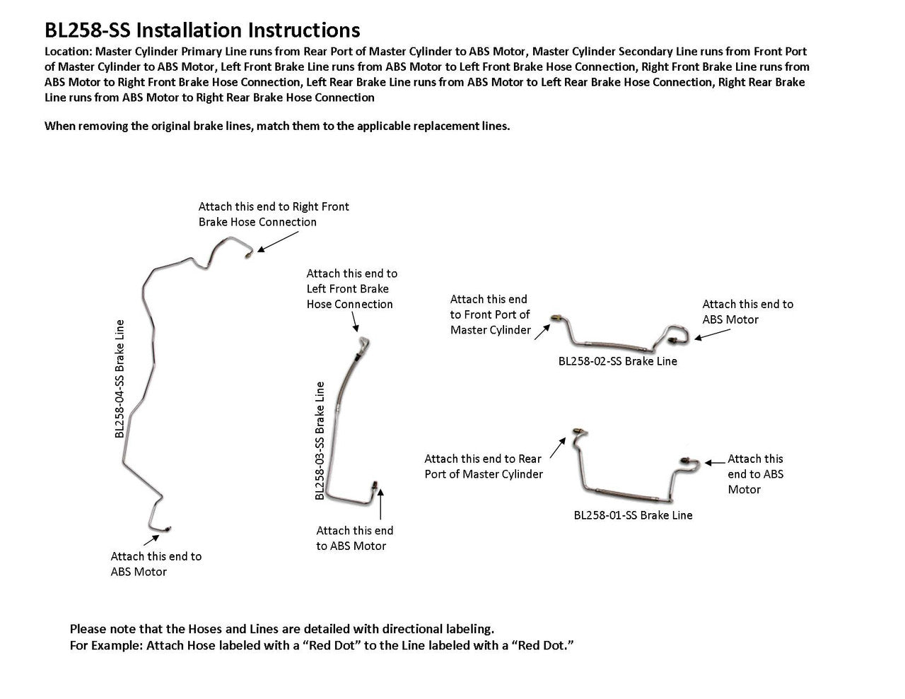 Master Cylinder Primary Line runs from Rear Port of Master Cylinder to ABS Motor, Master Cylinder Secondary Line runs from Front Port of Master Cylinder to ABS Motor, Left Front Brake Line runs from ABS Motor to Left Front Brake Hose Connection, Right Front Brake Line runs from ABS Motor to Right Front Brake Hose Connection, Left Rear Brake Line runs from ABS Motor to Left Rear Brake Hose Connection, Right Rear Brake Line runs from ABS Motor to Right Rear Brake Hose Connection