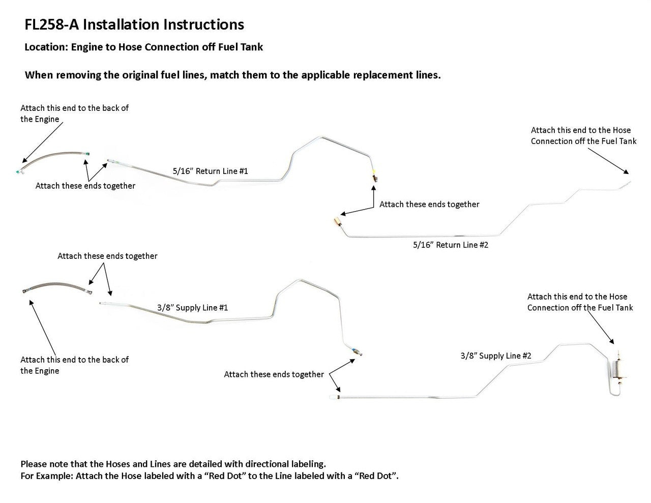 1 supply line 3/8" (in 2 easy to install sections), 1 return line 5/16" (in 2 easy to install sections), hoses to engine connection, 2 unions, 1 fuel filter