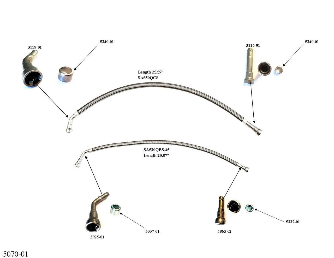 Stainless Steel braided Teflon Hoses between the fuel lines and the fuel tank for FL588-A, B, C, D, E, F. If the original steel fuel lines rust inside the quick connectors, it may cause the connector to seize which can make removal very difficult or impossible without destroying the o-rings within the connector. These lines connect between the fuel lines and the tank unit