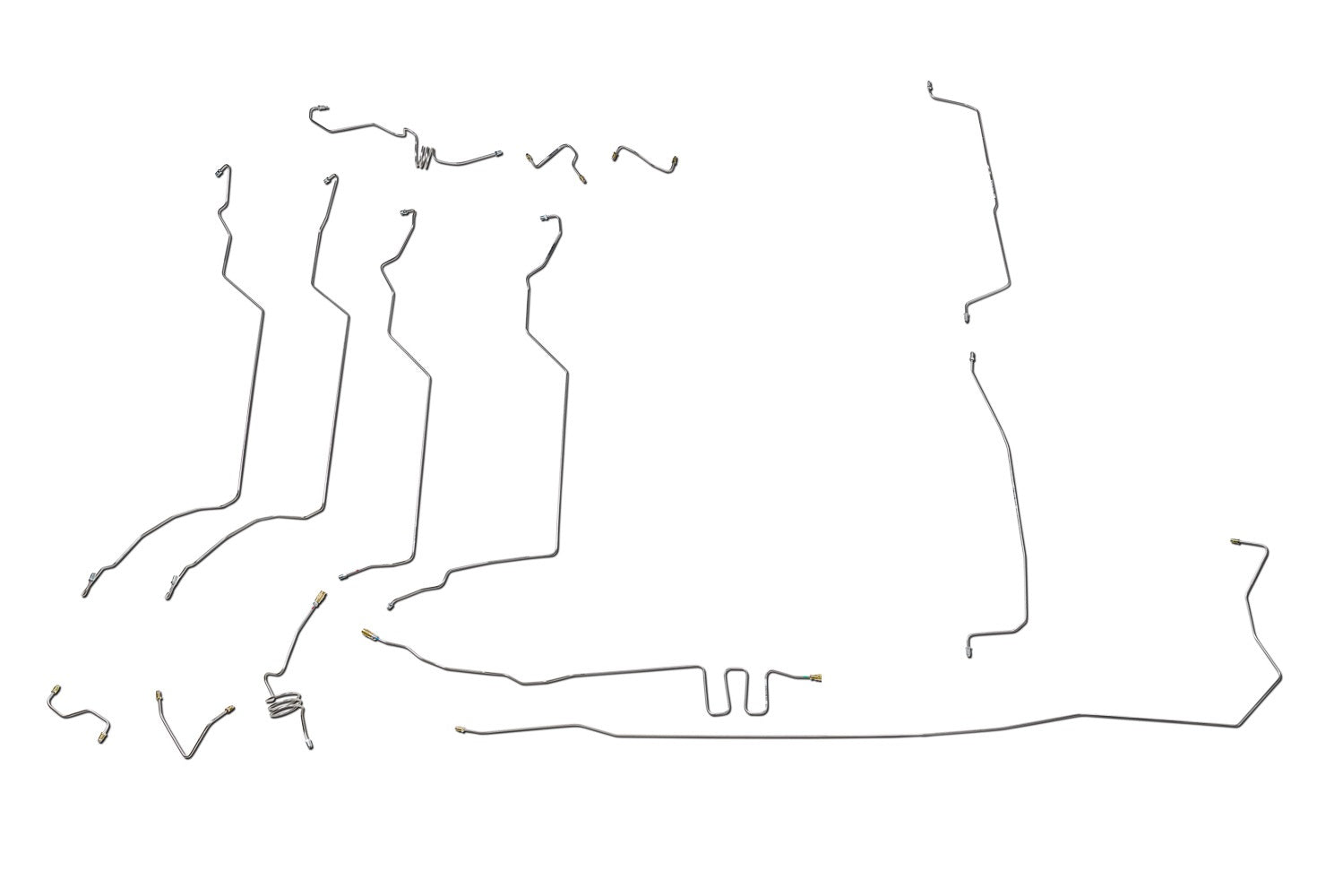1 Master Cylinder Primary Brake Line 3/16", 1 Master Cylinder Secondary Brake Line 3/16", 1 Left Front Brake Line 3/16" (in 4 easy to install sections), 1 Right Front Brake Line 3/16" (in 3 easy to install sections), 1 Intermediate Brake Line 3/16" (in 2 easy to install sections), 1 Intermediate Brake Line 3/16", 1 Rear Axle Brake Line 3/16" (2 sections), Does NOT include Brake Hoses
