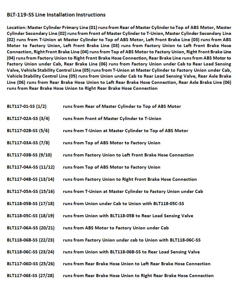 Please Note: Before installing your brake line, shipping bends will need to be removed from the lines labeled BLT117-03A-SS, BLT118-05B-SS, BLT118-05C-SS, BLT117-06A-SS, BLT118-06B-SS and BLT118-06C-SS. See the video below on how to remove the shipping bend