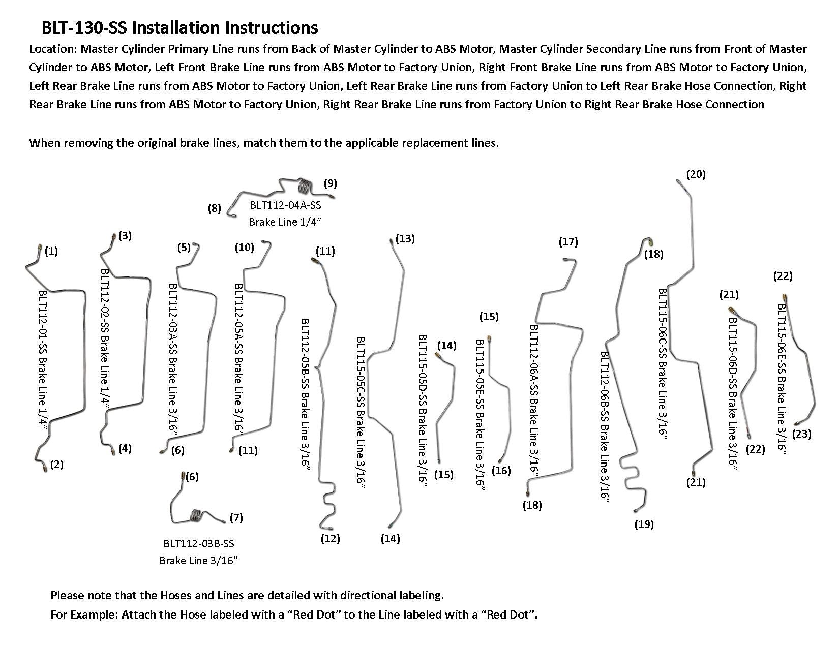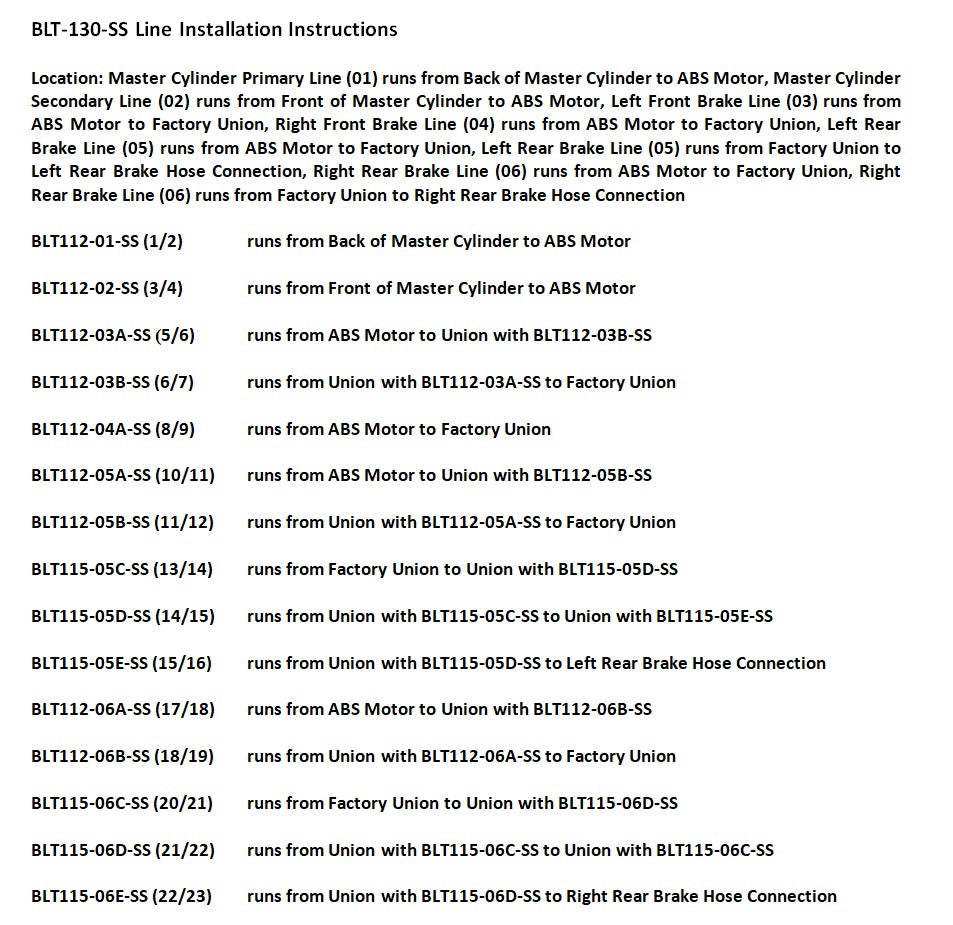 Master Cylinder Primary Line runs from Back of Master Cylinder to ABS Motor, Master Cylinder Secondary Line runs from Front of Master Cylinder to ABS Motor, Left Front Brake Line runs from ABS Motor to Factory Union, Right Front Brake Line runs from ABS Motor to Factory Union, Left Rear Brake Line runs from ABS Motor to Factory Union, Left Rear Brake Line runs from Factory Union to Left Rear Brake Hose Connection, Right Rear Brake Line runs from ABS Motor to Factory Union, Right Rear Brake Line runs from Factory Union to Right Rear Brake Hose Connection
