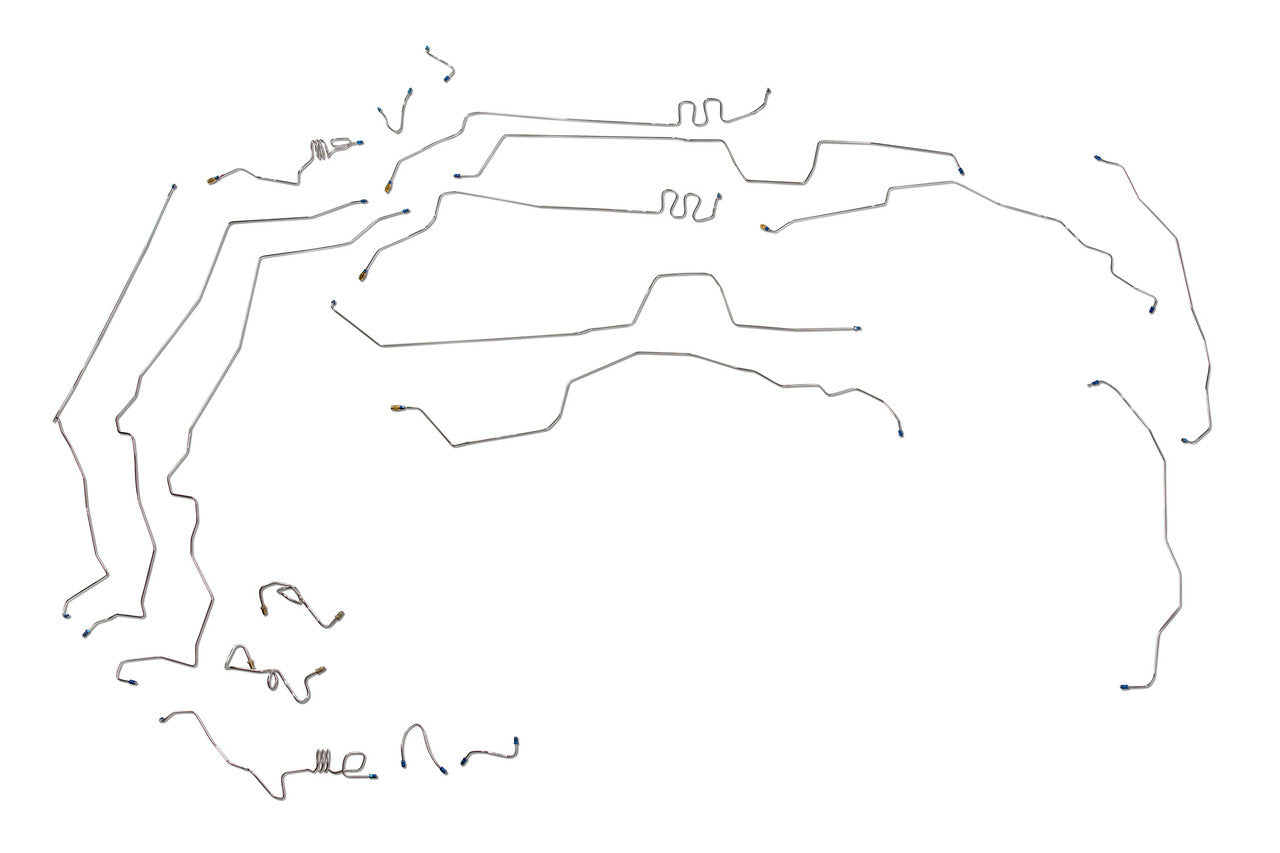1 Master Cylinder Primary Brake Line 1/4", 1 Master Cylinder Secondary Brake Line 1/4", 1 Left Front Brake Line 3/16" (in 3 easy to install sections), 1 Right Front Brake Line 3/16" (in 4 easy to install sections), 1 Left Rear Brake Line 3/16" (in 5 easy to install sections), 1 Right Front Brake Line 3/16" (in 5 easy to install sections), Does NOT include Brake Hoses