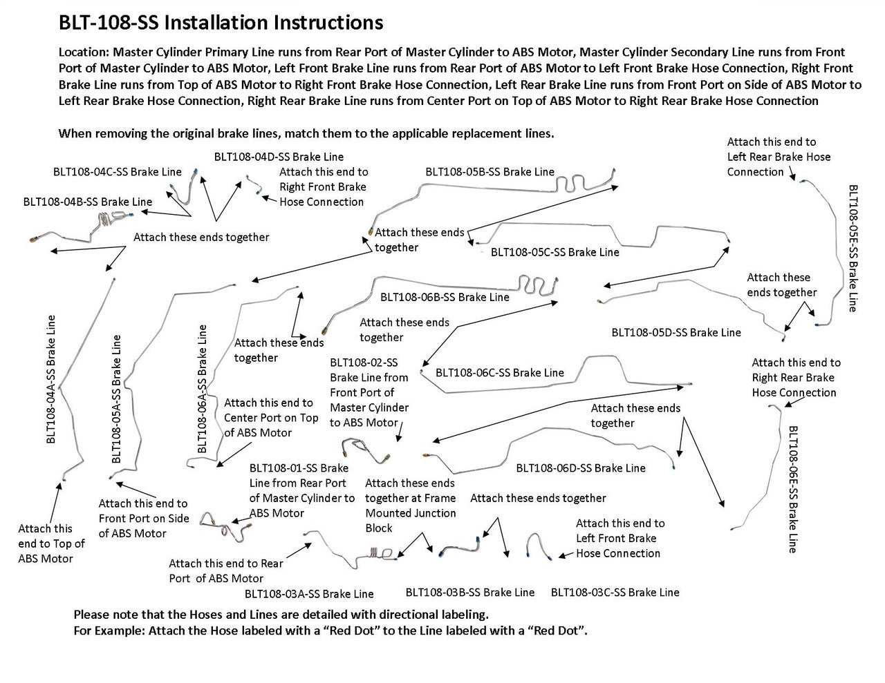 Master Cylinder Primary Line runs from Rear Port of Master Cylinder to ABS Motor, Master Cylinder Secondary Line runs from Front Port of Master Cylinder to ABS Motor, Left Front Brake Line runs from Rear Port of ABS Motor to Left Front Brake Hose Connection, Right Front Brake Line runs from Top of ABS Motor to Right Front Brake Hose Connection, Left Rear Brake Line runs from Front Port on Side of ABS Motor to Left Rear Brake Hose Connection, Right Rear Brake Line runs from Center Port on Top of ABS Motor to Right Rear Brake Hose Connection
