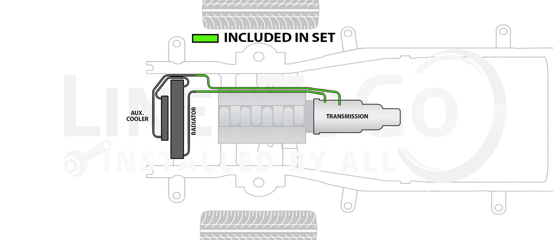 Outlet Line runs from Rear Transmission Connection to Driver's Side Radiator Oil Cooler Connection, Inlet Line runs from Front Transmission Connection to Passenger's Side Radiator Oil Cooler Connection